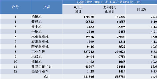 2020年1-6月我國主要工程機(jī)械產(chǎn)品銷量