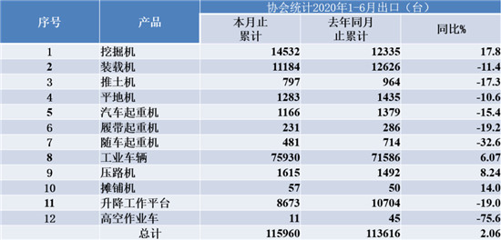 2020年1-6月我國主要工程機(jī)械產(chǎn)品銷量