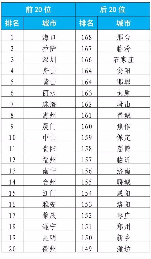 前20位和后20位城市名單